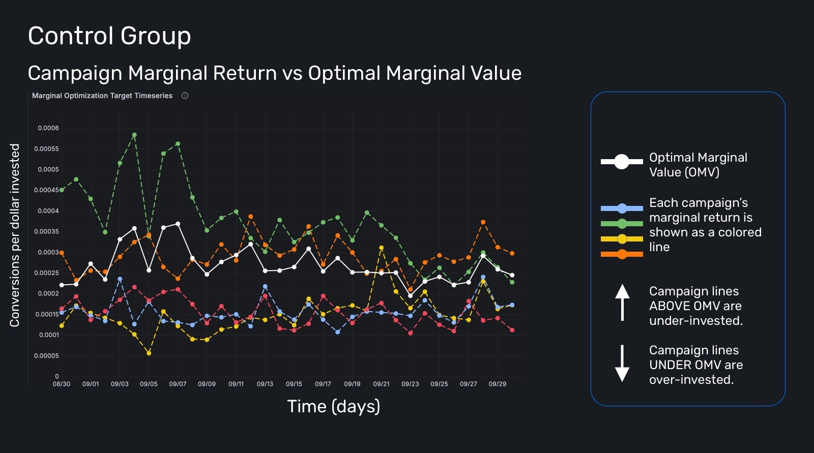- Below the OMV → it’s over-invested. Every extra dollar is less efficient — it costs more to get each new conversion.