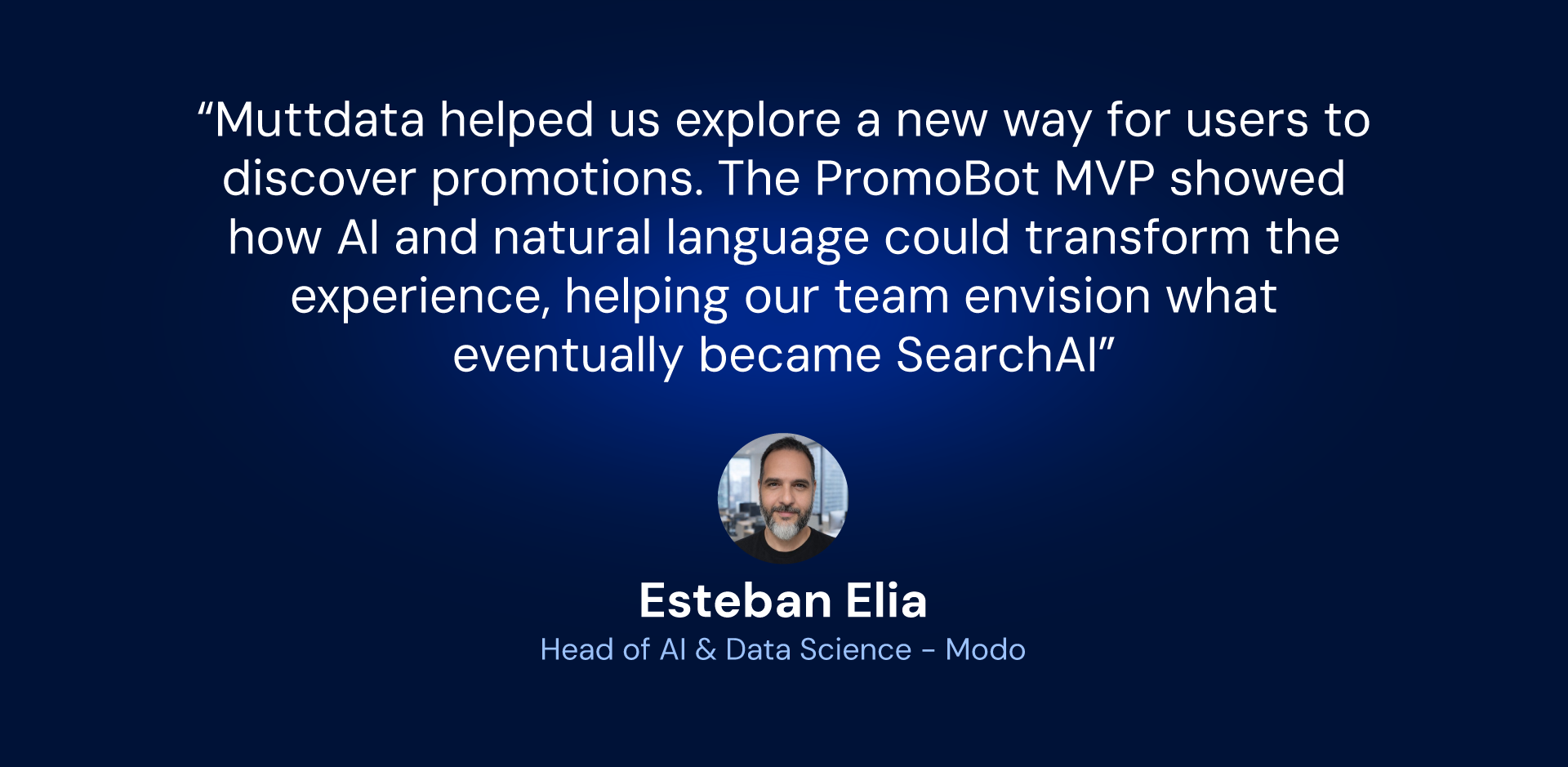 The insights gained from the PromoBot MVP helped Modo refine the product vision for AI-powered promotion discovery.