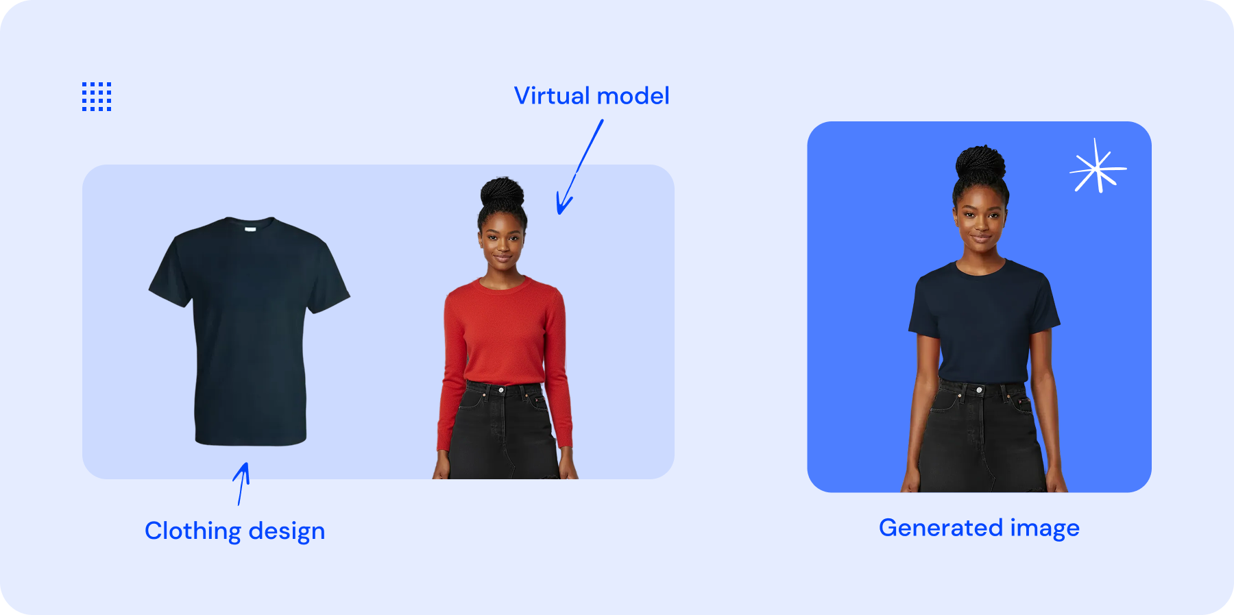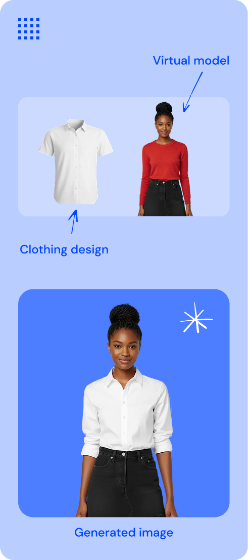 Coloca fácilmente tus diseños de ropa en modelos virtuales e imagina cómo se verán las prendas cuando las lleves puestas, sin necesidad de muestras físicas.