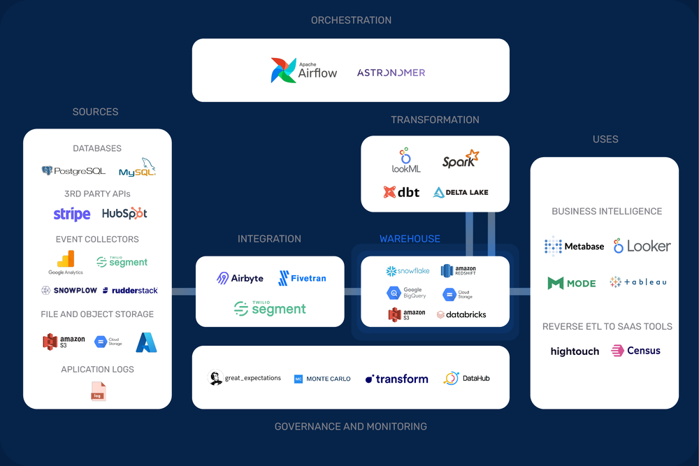 The purpose of this stack, which centers around an ecosystem of tools, is to support the collection, movement, storage, transformation, analysis and operationalization of data. Essentially, to make businesses data-enabled and truly data-driven.
