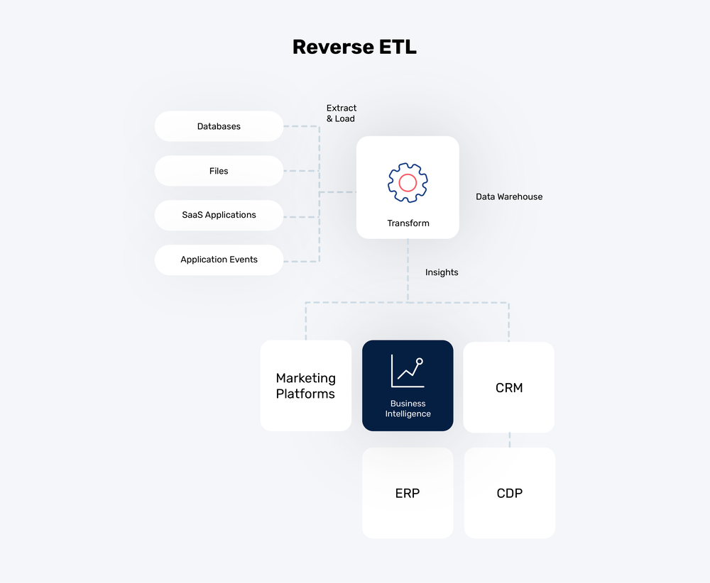 In reverse ETL, data is extracted from the data warehouse or data lake, transformed inside that same warehouse (basically meaning it’s changed into the formats needed by the third-party systems used in the company), and then loaded into that third party system for insights, action, etc.